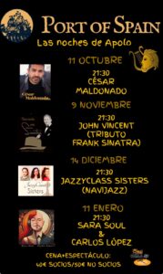 “Este otoño Apolo, el dios griego de la música, pone a tu alcance un nuevo ciclo de conciertos en el Port of Spain, donde podrás disfrutar de una cena durante la actuación.